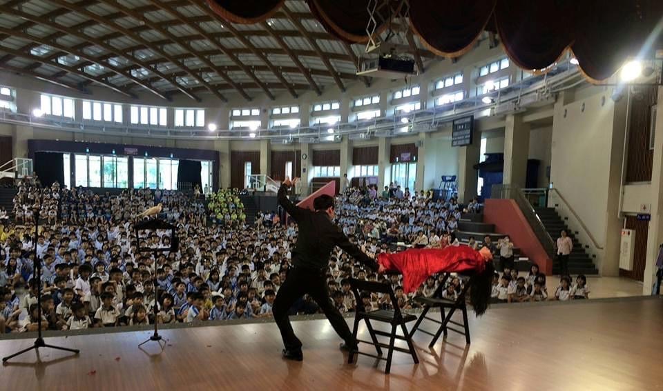 面對全校上千名師生,邀請老師和同學一起上台表演互動魔術,